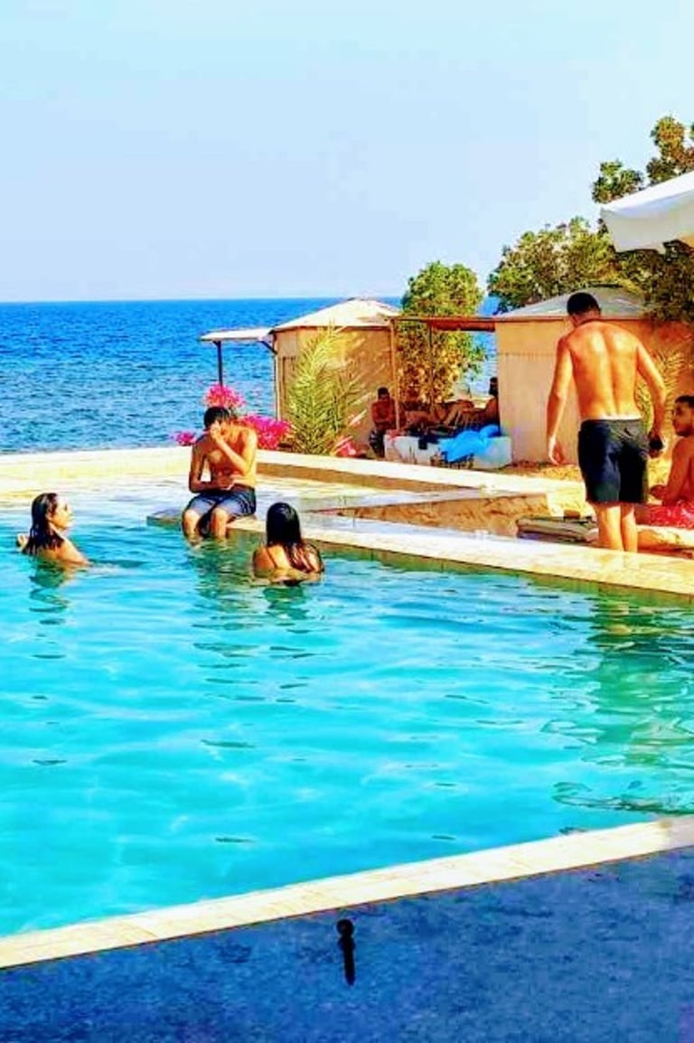 Η πισίνα της παραλιακής κατασκήνωσής μας προσφέρει μια εκπληκτική θέα στην Ερυθρά Θάλασσα, δημιουργώντας μια ήρεμη και μαγευτική ατμόσφαιρα. Τα κρυστάλλινα νερά σας προσκαλούν να κάνετε μια δροσιστική βουτιά και να απολαύσετε το εκπληκτικό περιβάλλον. Περιτριγυρισμένος από ομπρέλες και ξαπλώστρες, ο χώρος της πισίνας μας είναι η τέλεια όαση για χαλάρωση.